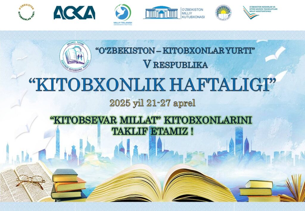 🇺🇿 2025 yilning 21-27 aprel kunlari Urganch tuman axborot-kutubxona markazida «O’zbekiston kitobxonlar yurti» V — Respublika 📖 “Kitobxonlik haftaligi” o‘tkaziladi. 📚 Markazimizda hafta davomida turli adabiy kechalar, rasmli ko‘rgazmalar, kitob taqdimotlari, taniqli shoir, shoira va yozuvchilar bilan uchrashuvlar, davra suhbatlari, tanlovlar, viktorina o’yinlari va boshqa ko‘pgina ma’naviy-ma’rifiy tadbirlar bo‘lib o‘tadi.🤝 Shu munosabat bilan barcha kitobsevar …